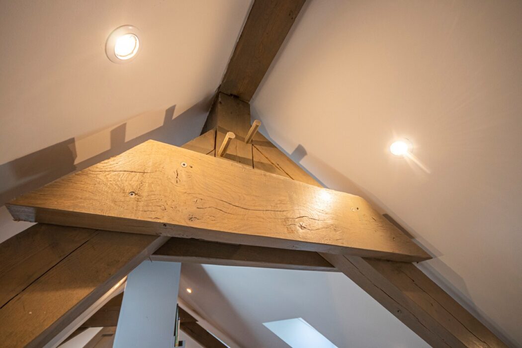 La ferme du toit a déjà été achevée dans cette nouvelle construction et fournit beaucoup de lumière à l'étage inférieur grâce aux fenêtres et au plafond ouvert.