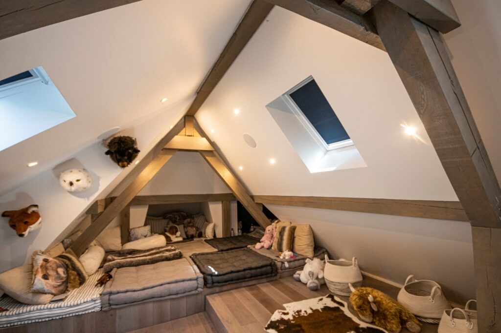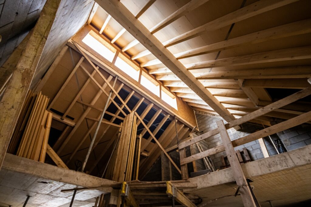 The roof truss has already been completed in this new building and provides plenty of light to the lower floor through the windows and open ceiling.